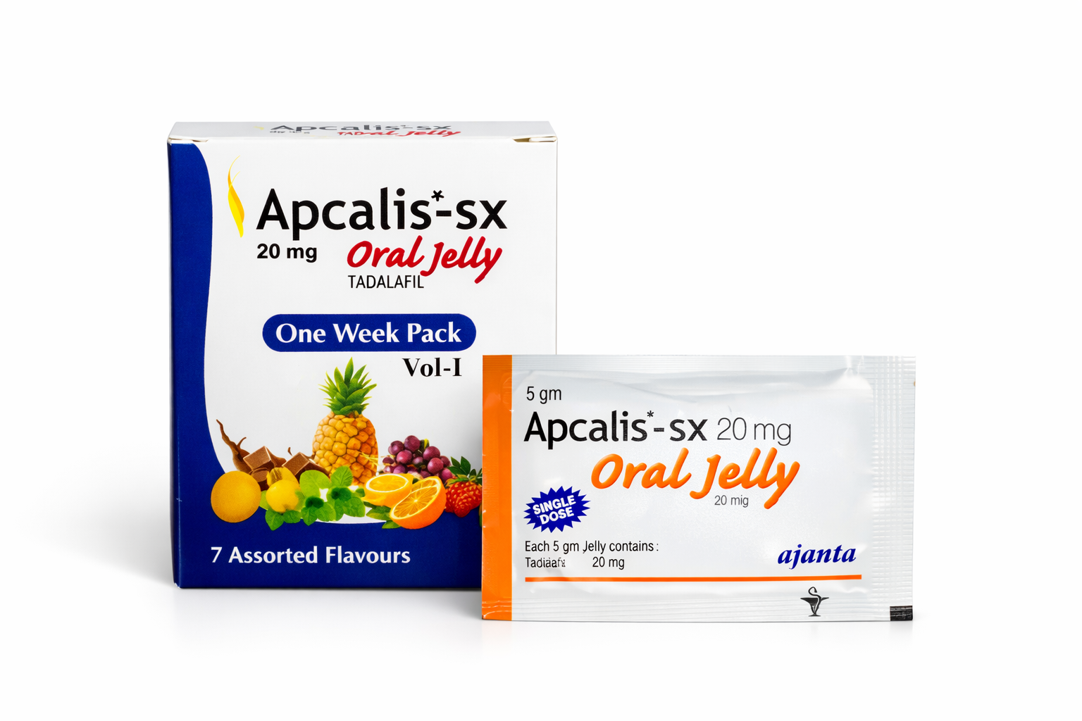 Apcalis-SX Oral Jelly 20mg contains Tadalafil, a fast-acting treatment for erectile dysfunction. Convenient oral jelly sachet that helps improve blood flow and support stronger erections.