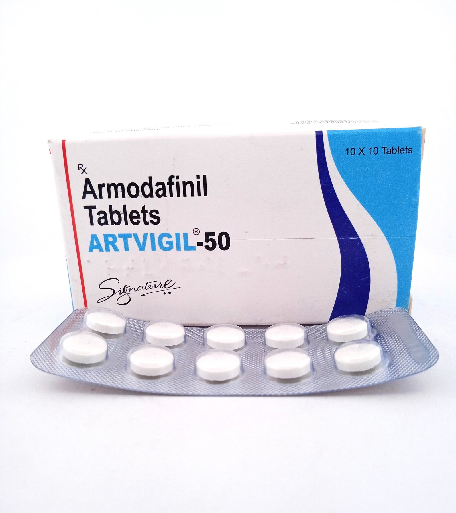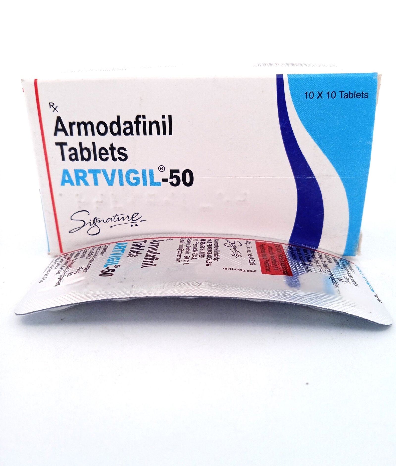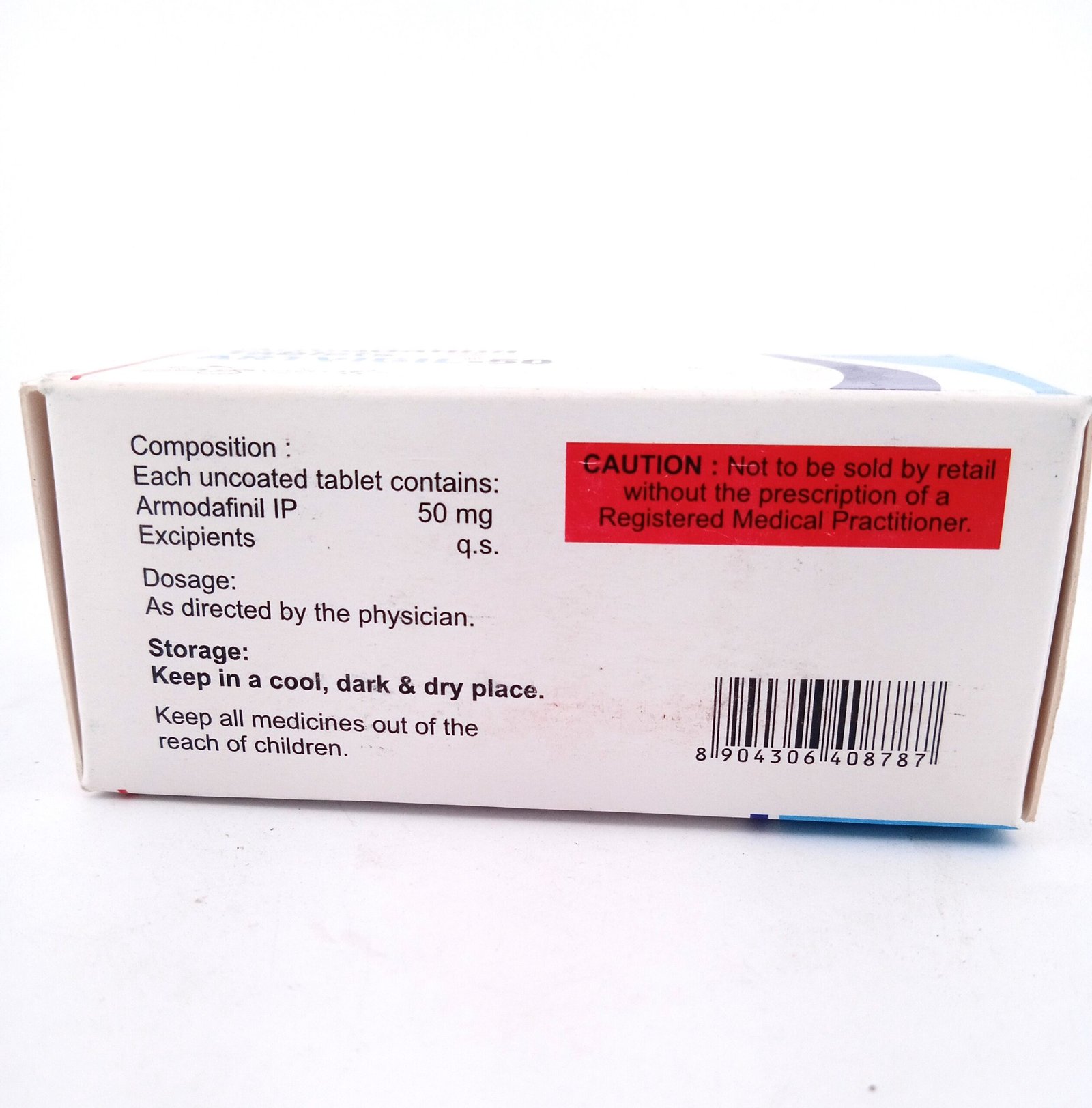 Artvigil 50 contains Armodafinil 50 mg, a wakefulness-promoting medicine used to manage mild excessive daytime sleepiness in narcolepsy, sleep apnea, and shift work disorder. Rx required.